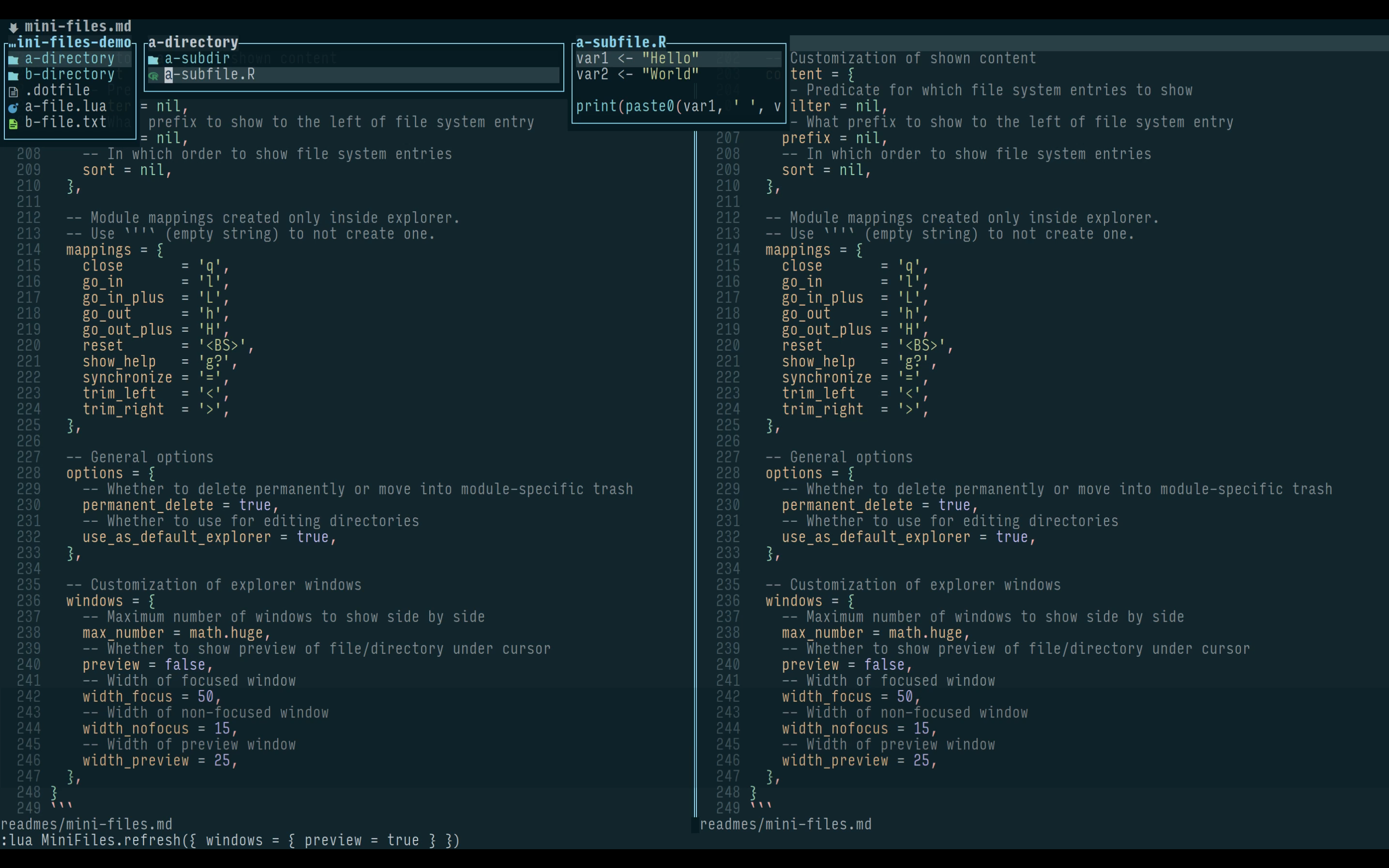 Around two weeks ago I’ve announced the release of mini.files - a file explorer module of mini.nvim with column view navigation and “edit text to manipulate file system” design. This resulted into a great feedback from the community, much of which turned into new features.